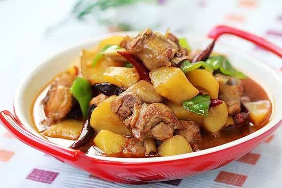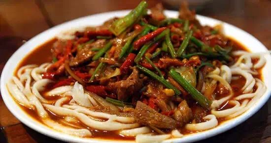 大盤雞要有皮帶面(皮帶寬的面條),才能兼具肉食、主食、蔬菜的營養價值