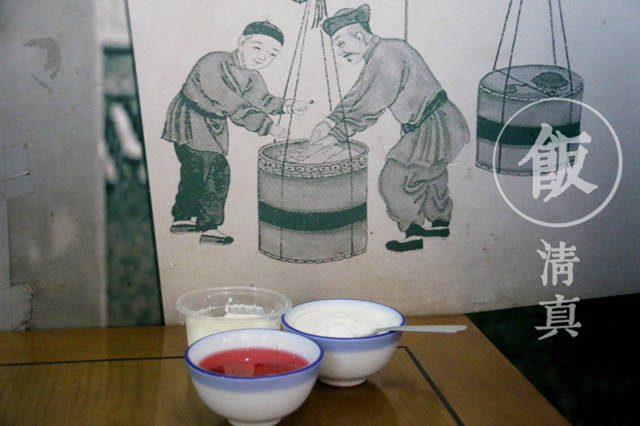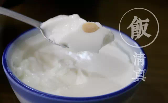 藍色釉的小白陶瓷碗里裝八分的奶酪,中間點一兩顆黃色的瓜子仁兒,擺在眼前,卻不忍破壞。想起“新鮮味美數(shù)燕都,敢與佳人賽雪膚,飲罷相如煩解渴,芳生齋頰潤于酥”的贊美,還是狠心下了勺。不酸不甜,濃稠適宜,暗自欣喜:也算嘗到宮廷的味道了。聽說奶酪魏家的絕活就是制作合碗酪,做出來的奶酪把容器倒過來都不灑。本也想倒過碗來試試,卻因早已吃了幾口而作罷。