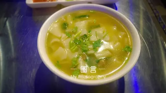 【羊肉面片】揪成指甲蓋大的面片,加上羊肉丁、香菜,淋上香油,入口爽滑細膩,面很勁道。愛吃辣椒的人還可以調點紅油,放點醋,味道別具一格。