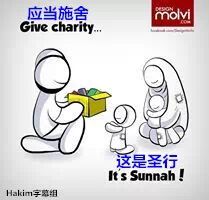穆圣說:“每個穆斯林每天都在進行施舍”,有人問他:“誰能夠夠這樣呢?”穆圣回答:“你移開道路上的障礙就是施舍;你指點給別人的問路就是施舍;你探望病人就是施舍;你命人行善就是施舍;你制止人作惡就是施舍;你回答他人問安就是施舍。”